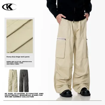 11KN Vintage desgastado plisado StraightTrendy Cargo pantalones estilo americano cremallera tridimensional suelta Casual pantalones largos hombres