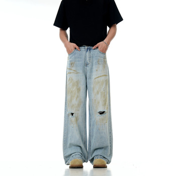 11KN Distressed Dirty-Dyed Ripped American-Style Denim Jeans Mediano Hombres Mujeres Suelto Casual Adelgazamiento Tridimensional de moda